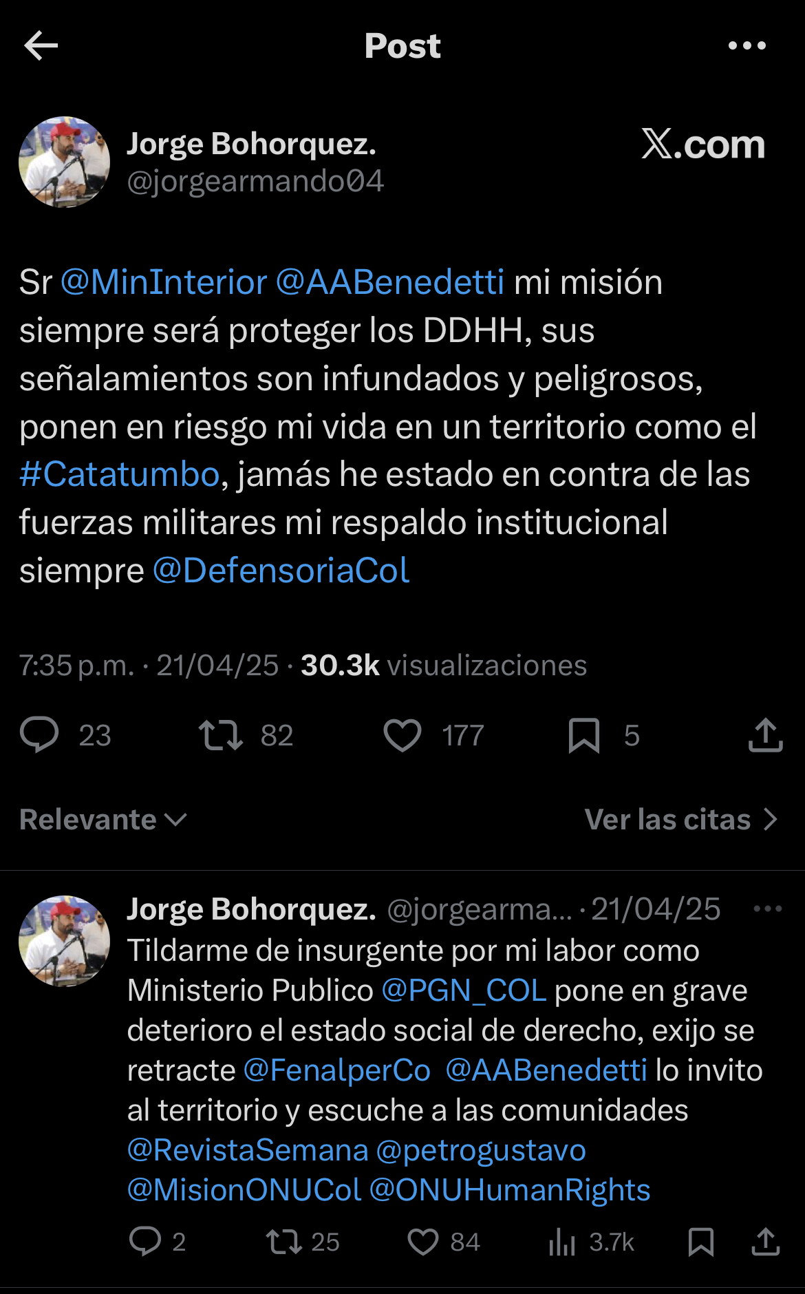 Esa publicación generó una respuesta por parte del ministro del Interior, Armando Benedetti, quien no sólo defendió la actuación de la fuerza pública, sino que lanzó acusaciones en X el 21 de abril: “Señor Personero de Ocaña @jorgearmando04, negar la efectividad del decreto de conmoción interior en el Catatumbo es desconocer el enorme esfuerzo de nuestras Fuerzas Militares. Quien diga lo contrario es sospechoso de estar ayudando a la insurgencia de este país”. Esa publicación tuvo 167.500 visualizaciones.