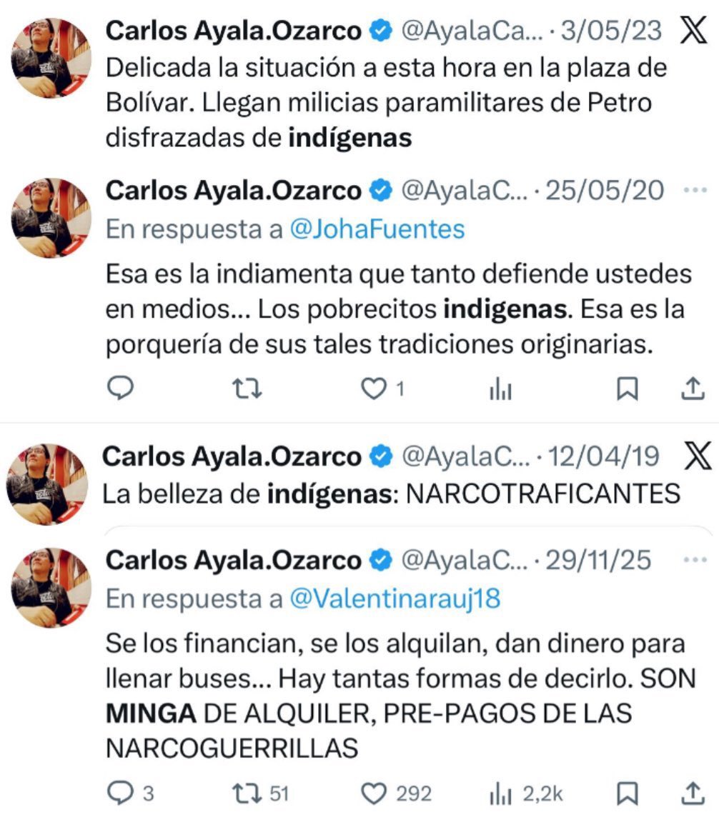 Ayala, que se identifica como periodista en su perfil de X, dijo que estaba haciendo cubrimiento del evento. En otro video publicado horas antes, hace un recorrido por la plaza donde graba a los indígenas desde lejos mientras comenta que “hay comunidad indígena trasteada. Allá atrás se ve la Minga de alquiler como siempre”.