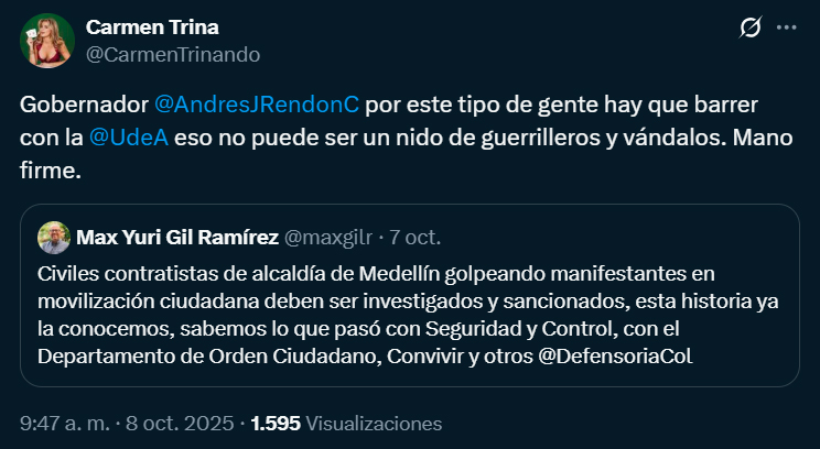 Minutos después de esta publicación, la cuenta en X @CarmenTrinando respondió con una amenaza y estigmatización a Gil además de una incitación a la violencia: “Gobernador @AndresJRendonC por este tipo de gente hay que barrer con la @UdeA eso no puede ser un nido de guerrilleros y vándalos. Mano firme”.